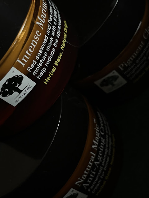 Kadangi pastaruoju metu buvau sunaudojusi visus mėgstamus bei naudojamus kremus, žvalgiausi kažko labai gerai maitinačio bei odą atstatančio vakarui, taip pat įvairių variantų su antioksidantais. Iš "New Nordic" akį patraukė Natural Magic™ Anti-Ageing Cream, Pigment Clear™ Cream Šviesinamasis kremas su antioksidantais bei Intense Marine™ Mask Drėkinamoji kaukė su patempimo efektu. Iš karto pagirsiu priemonių indelius, tvirtas, tamsintas stiklas, puikiai apsaugo nuo tiesioginių saulės spindulių, nepaprastai išskirtinis kvapas - granato persipinantis su baltosios putonės žiedų kvapu, šaltalankiais, abrikosais bei žolėmis. Kas ieško bekvapės priemonės, ši tikrai ne jums, kadangi kvapas itin stipriai juntamas ir bent jau man yra labai malonus bei nedažnai pasitaikantis. "New Nordic" sudėtyje dažnai naudoja Paprastųjų granatmedžio ekstraktą ir tikrai ne šiaip sau. Viena iš priežąsčių - elago rūgštis, turinti antioksidacinių savybių. Granato vaisiuose gausu polifenolių, taninų ir antocianinų. Šis ingredientas padeda detoksikuoti laisvuosius radikalus, taip pat apsaugo odą, kurią galėjo pažeisti tokie aplinkos veiksniai kaip UV spinduliai. Granatų granulėse esantys antocianai veikia panašiai, kaip vitaminas C, esantis citrusiniuose vaisiuose, yra naudingas odai. Na o dabar apžvelkime kiekvieną produktą atskirai.